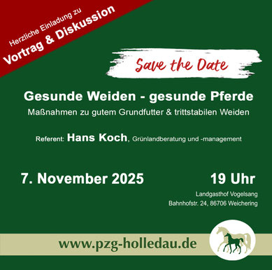 Auch wenn die Weidesaison bereits hinter uns liegt, ist jetzt im Herbst der ideale Zeitpunkt, um sich mit der Planung und Optimierung der Grünlandpflege für das kommende Jahr auseinanderzusetzen. Im Rahmen eines Vortrags- und Diskussionsabends gibt Hans Koch praxisnahe Einblicke in wirksame Maßnahmen zur Förderung von hochwertigem Grundfutter und trittstabilen Weiden. Thematisiert werden unter anderem Bodenuntersuchung, Pflege, Düngung, Arten- und Sortenwahl sowie Nach- und Neueinsaat. Auch die Bekämpfung von Unkräutern und Giftpflanzen wird beleuchtet.